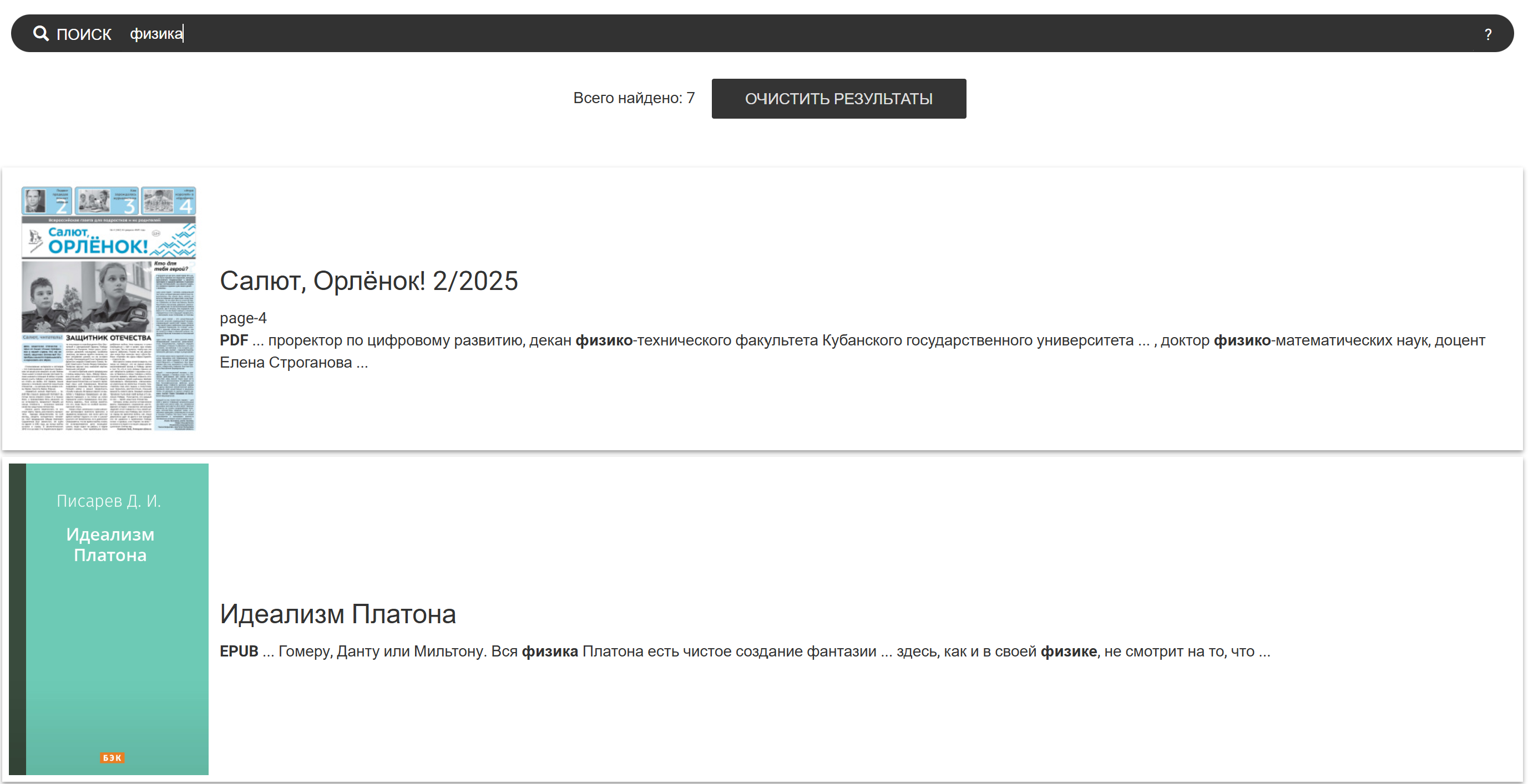 Полнотекстовый поиск извлекает текст из PDF, ePub и из других форматов с текстом и позволяет находить документы при попадании в текст ресурса.
